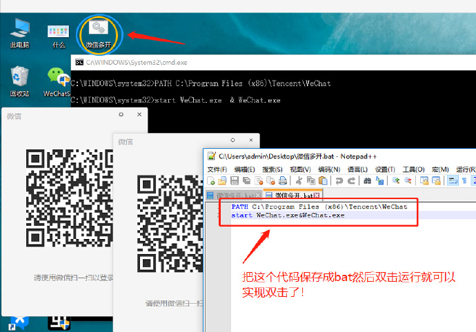 start WeChat.exe&WeChat.exe就是双开, 如果要再多开一个就在后面加一个&WeChat.exe 比如 start WeChat.exe&WeChat.exe &WeChat.exe就是三开。